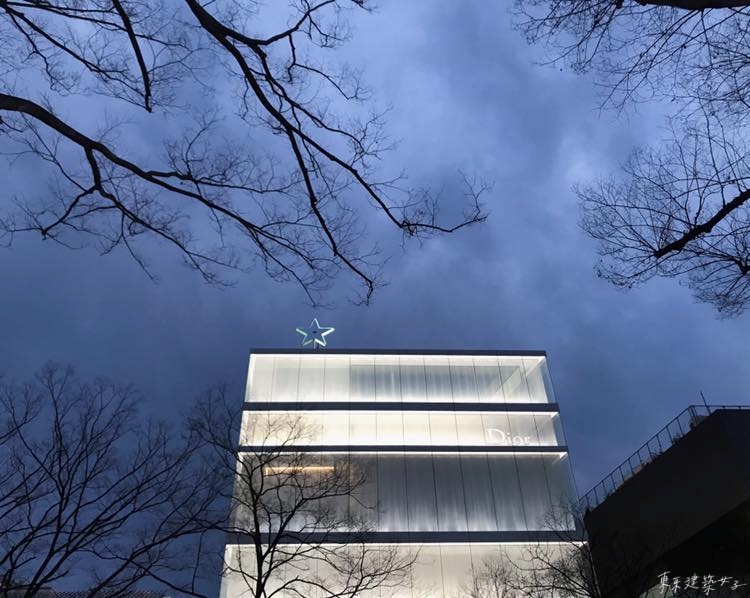 DIOR 表參道店普利茲克建築獎得主妹島和世設計,建築外牆看似使用玻璃,實際上採用半透明的聚碳酸酯板材搭建。白天映照自然光線,夜晚的燈光映照後呈現如夢似幻的輕盈質感,帶出 DIOR 優雅的品牌形象。