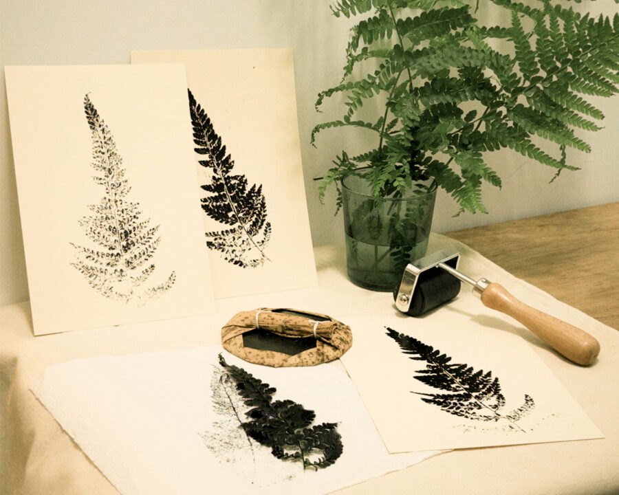以蕨類植物為主題,透過觀察葉片的形態與紋理,進行壓印版畫創作。