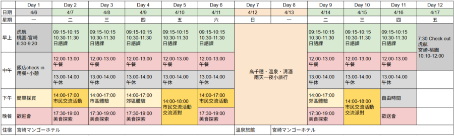 這趟短期遊學共 12 日,以「上午學習、下午戶外體驗」的方式安排。平日早上與日本籍老師在教室學習實用日語,中午用餐休息後,下午跟著帶路人走進市區、農園與宮崎在地社群交流,晚餐則在市區展開宮崎美食巡禮。過程中會鼓勵大家把學到的語言運用在當天的生活裡,行程中也會有兩天一夜前往高千穗的校外旅行,讓你在這 12 日內有吃有玩,更有不一樣的學習和新的體驗!